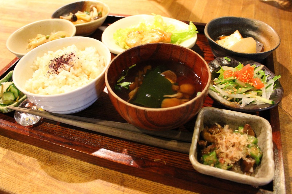 カフェではカラダにやさしい素材や調味料を使った家庭料理をいただくことができます。