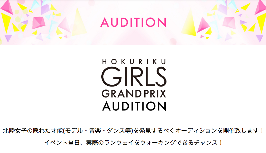 そのファッションショーにちなんで、北陸女子の隠れた才能(モデル・音楽・ダンス等)を発見するべくオーディションが開催されます。