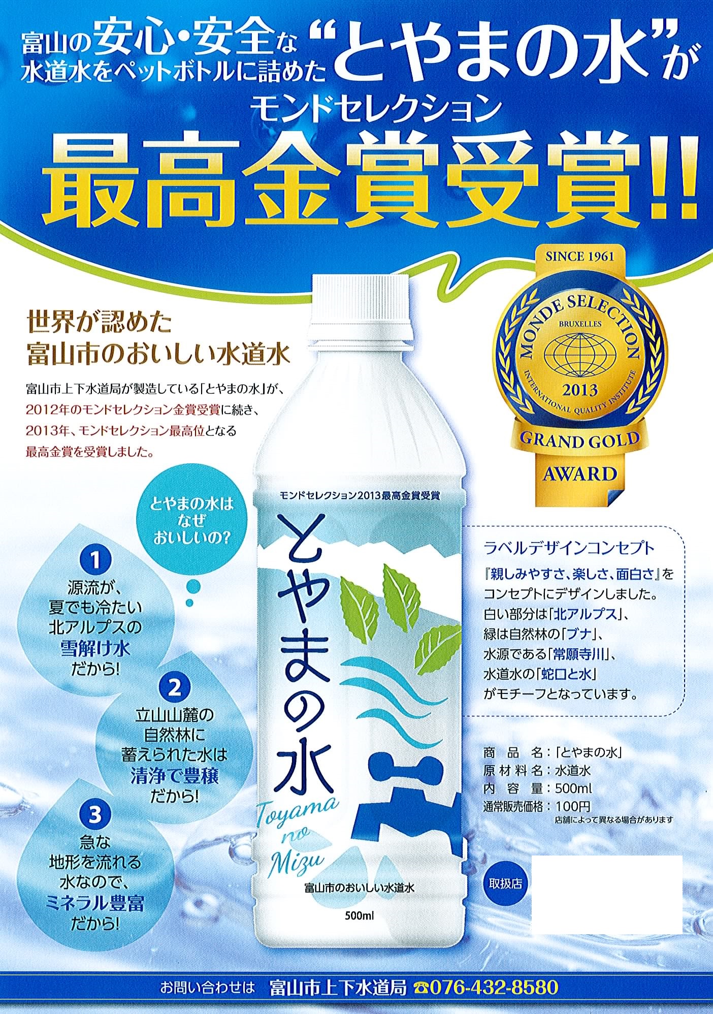 みなさんは富山市、高岡市、射水市の水道水がそれぞれ、「2016年度モンドセレクション」で金賞に選ばれたことをご存知でしょうか?