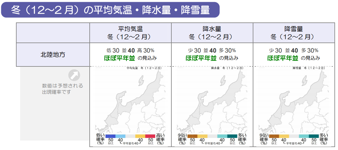 ・平年と同様の天候が見込まれることから、気温。降水量・降雪量はともにほぼ平年並みでしょう。