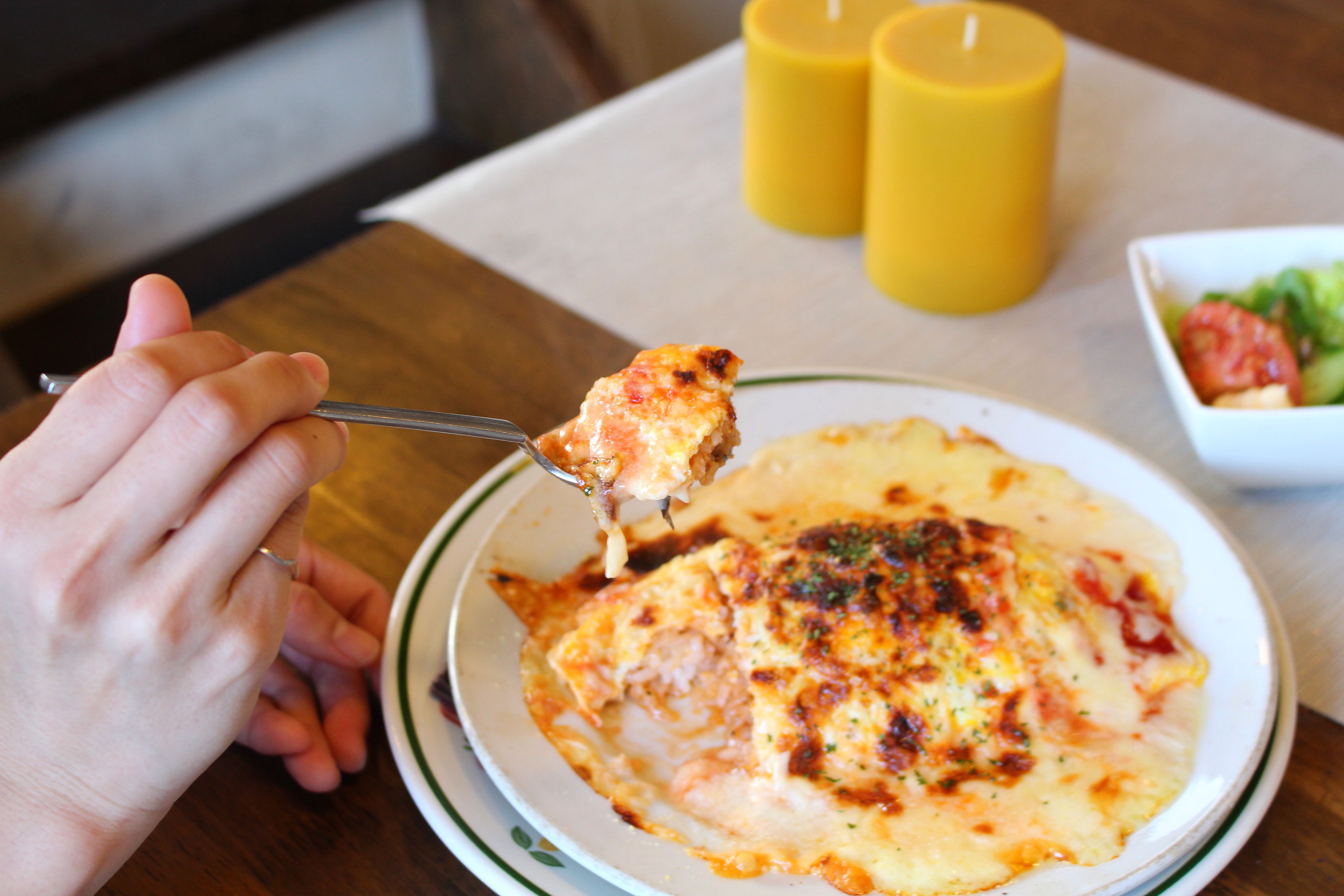 外側はカリッとしていて、中はふわふわチーズオムライスで新感覚の味。ボリュームが結構あるのだが、これはスプーンが止まりませんね。