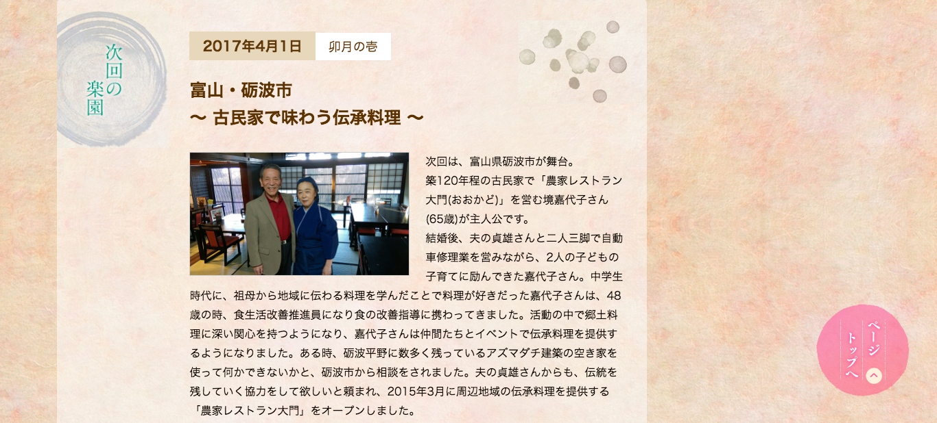 内容は、築120年ほどの古民家で「農家レストラン大門」を営んでる女性が主人公。