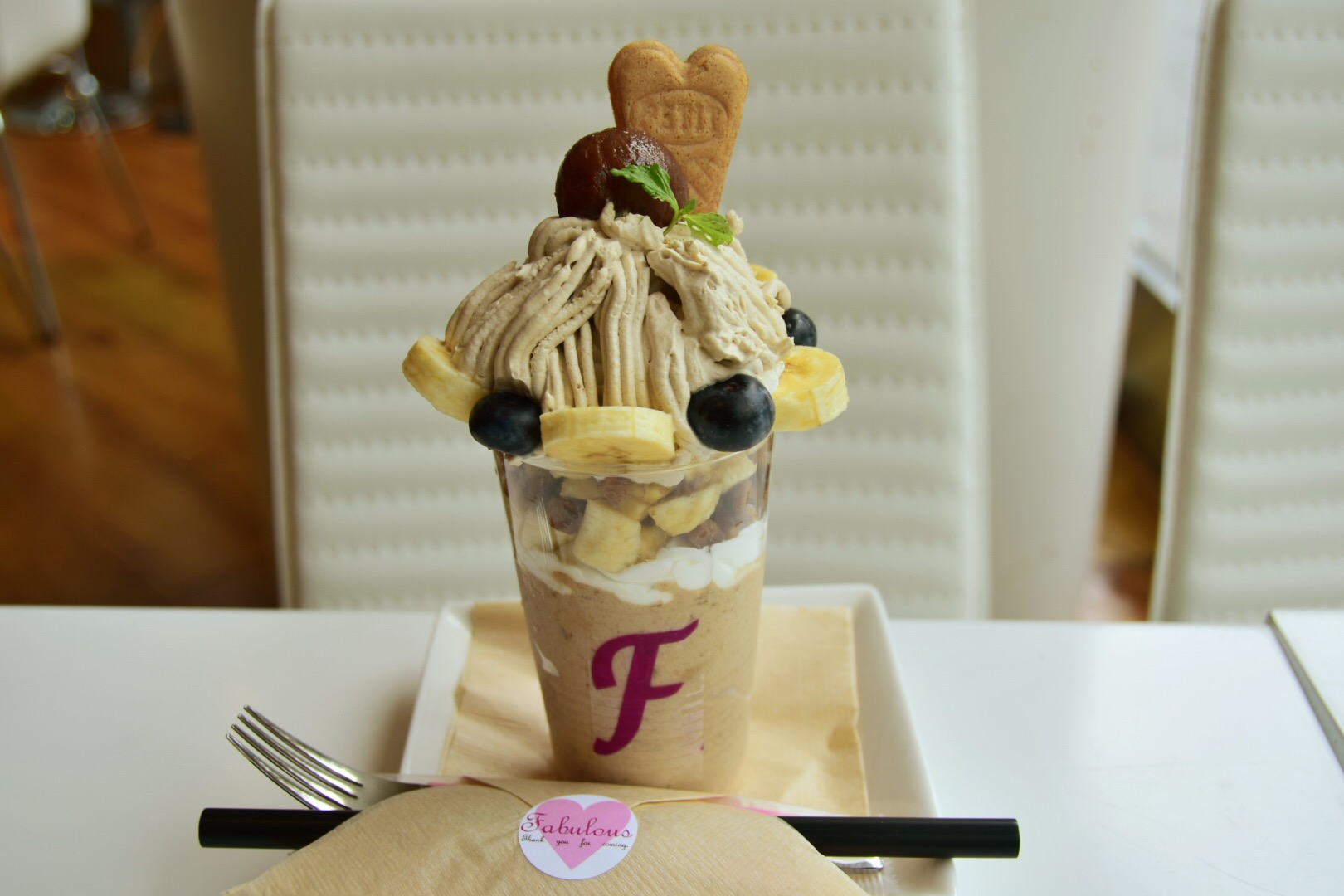 マロンクリームと、Fabulousのヘルシー豆乳クリームがふんだんに使われています。豆乳クリームのおかげで、あまりくどさは感じませんね。クリームの周りには、ブルーベリーとバナナが添えてあります。甘いマロンクリームを中和させるかのような甘酸っぱい大きな粒のブルーベリーがイイ仕事するんです!ベストオブアシストだよ!