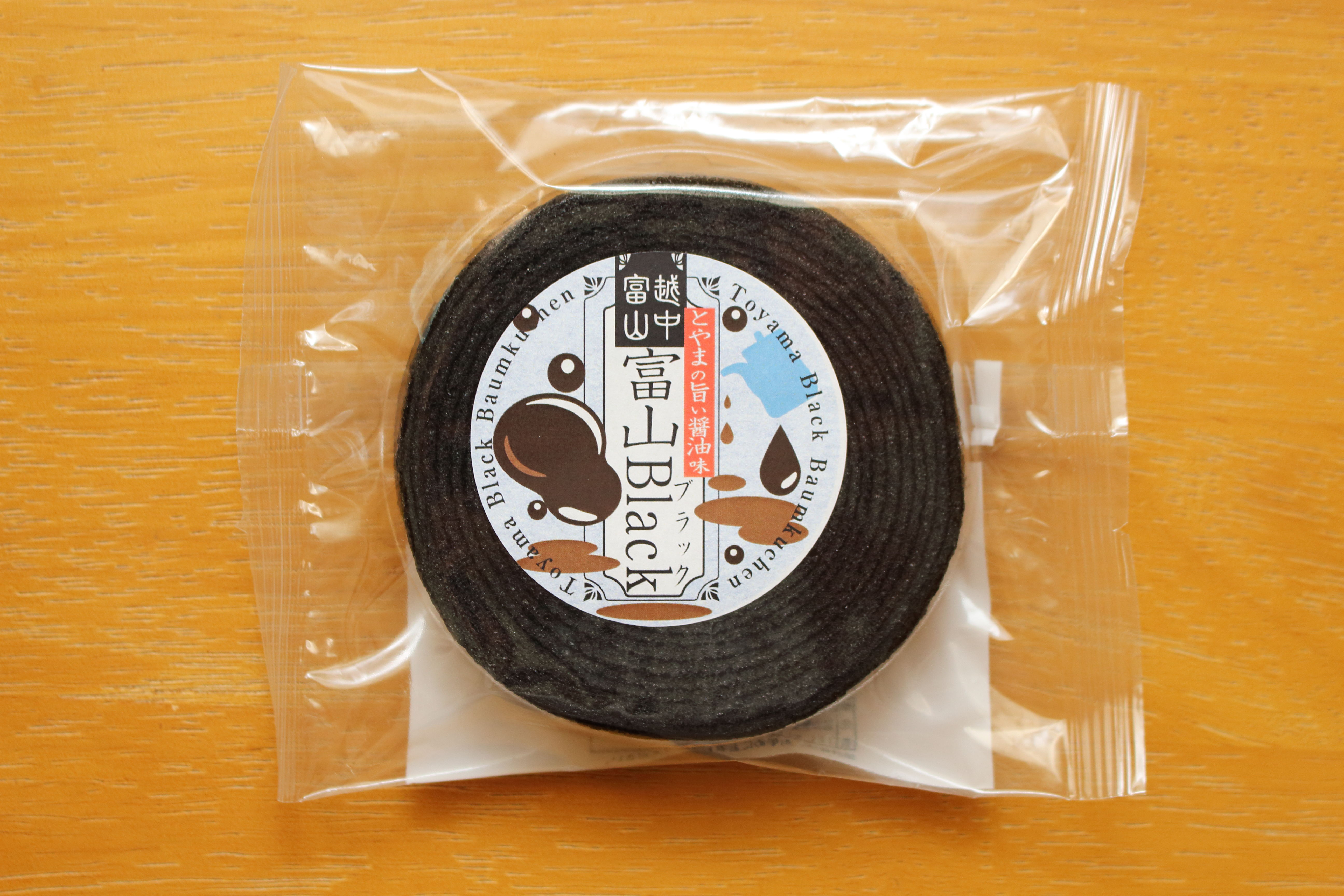 ただ、バウムクーヘンということで年輪のように生地が重なっているのが特徴。そもそもバウムクーヘンはドイツ語でバウム(木)+クーヘン(ケーキ)であり富山ブラックラーメンとは真反対の存在。