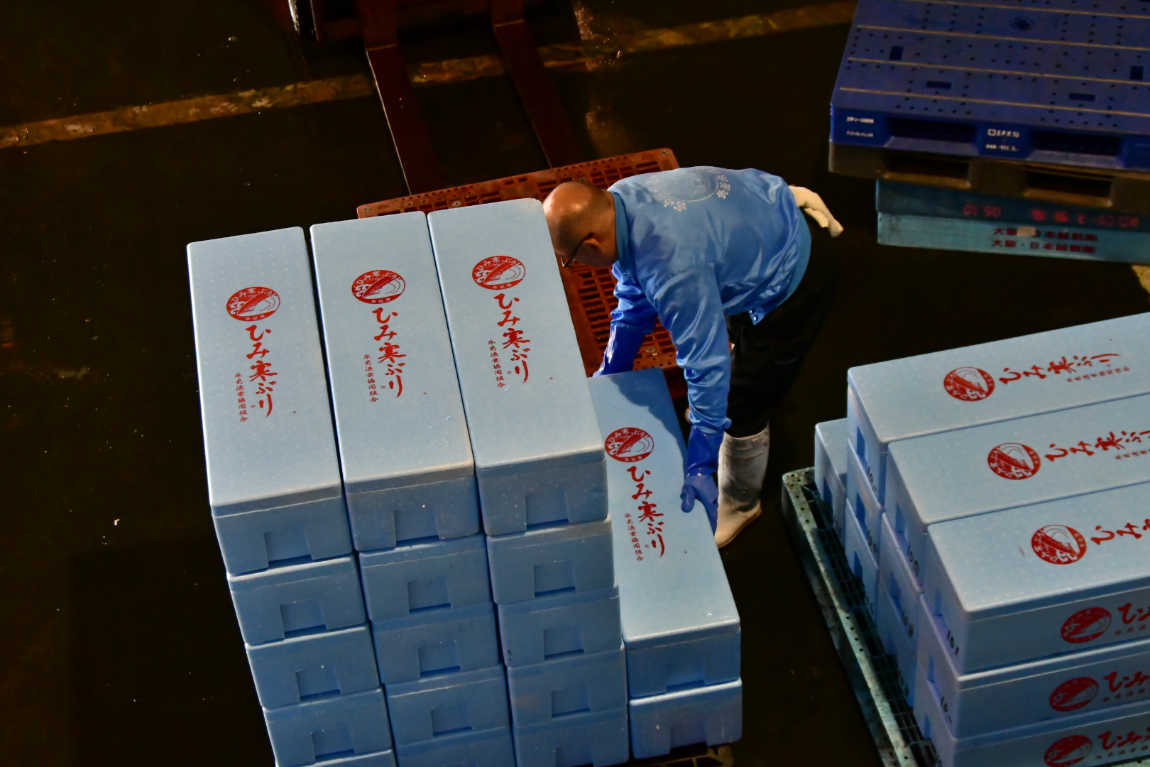 お昼頃なので、漁港での競りは終わっていて静かでしたが、寒ぶりの箱が沢山積んであります。