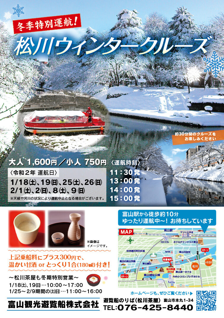 ※ご希望の日時の15分前までに松川遊覧船のりば(松川茶屋)にお越しください。当日、運航状況が心配な場合は、直接、松川茶屋(TEL.076-431-5418)にお問い合わせください。
