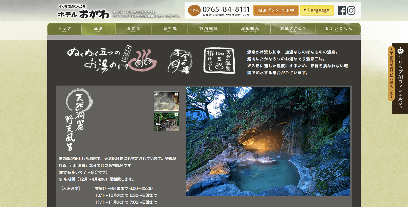 中でも「ホテルおがわ」には小川温泉名物でもある天然記念物指定の湯の華が凝固した洞窟風呂、大自然に囲まれた野天風呂や岩風呂、檜桶風呂など、趣向豊かな温泉があり、訪れる人々を癒しています。