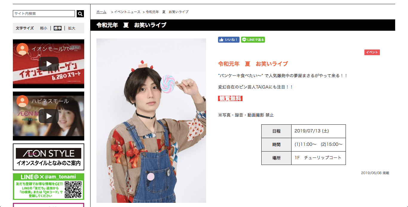 令和元年の夏のお笑いライブとして、”パンケーキ食べたい~”で人気爆発中の夢屋まさるがイオンモールとなみにやってきます。