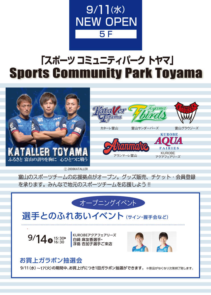 スポーツコミュニティパークトヤマ参加チーム ・カターレ富山 ・富山グラウジーズ ・富山GRNサンダーバーズ ・KUROBEアクアフェアリーズ ・アランマーレ富山