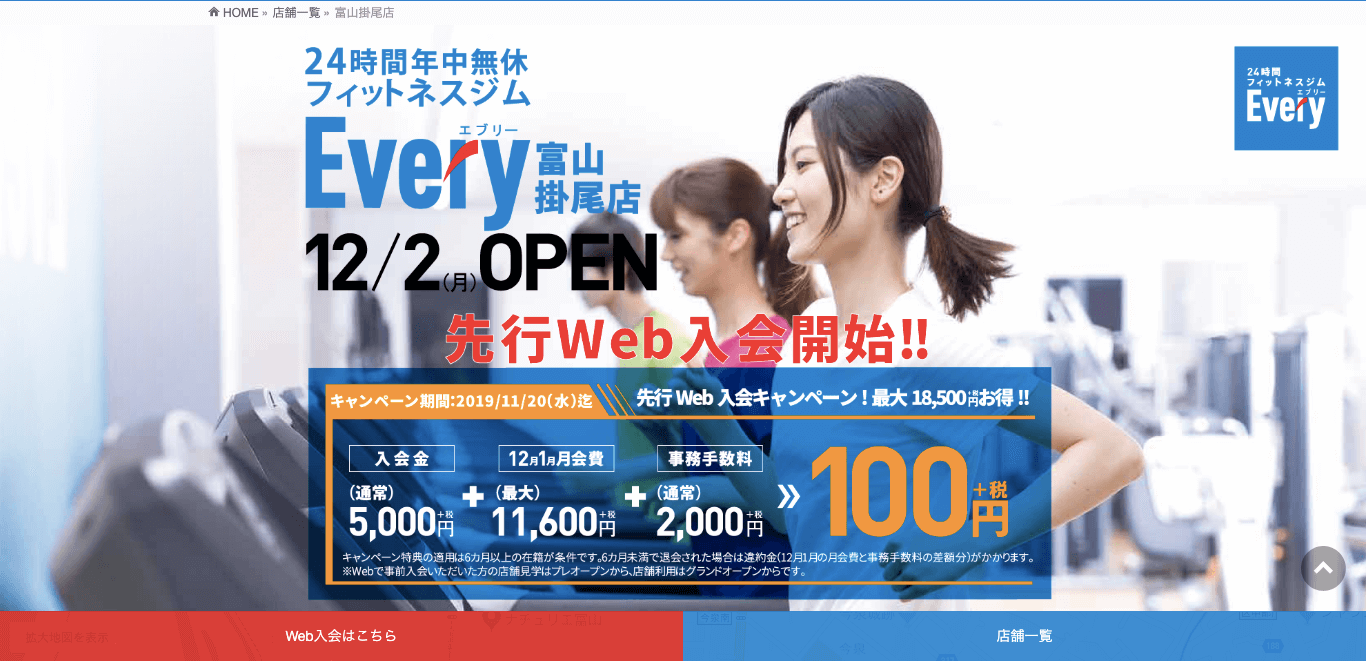 フィットネスジム Every富山掛尾店が12月2日にオープンします。
