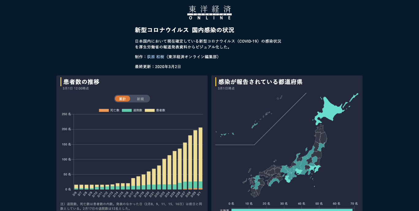 東洋経済ONLINEが日本国内において現在確定している新型コロナウイルス(COVID-19)の感染状況を厚生労働省の報道発表資料からビジュアル化しています。