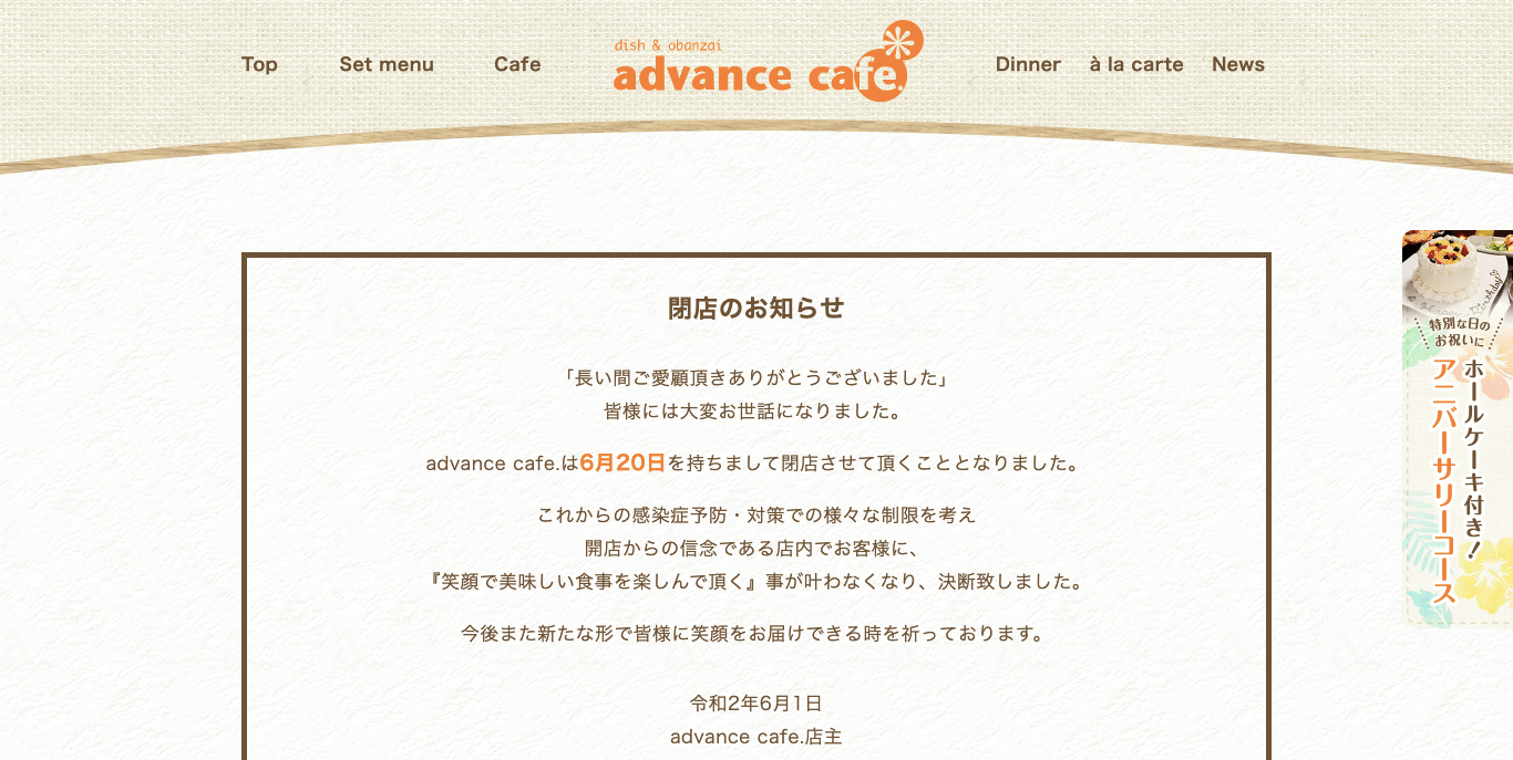 advance cafe.(アドバンスカフェ)が6月20日に閉店予定です。