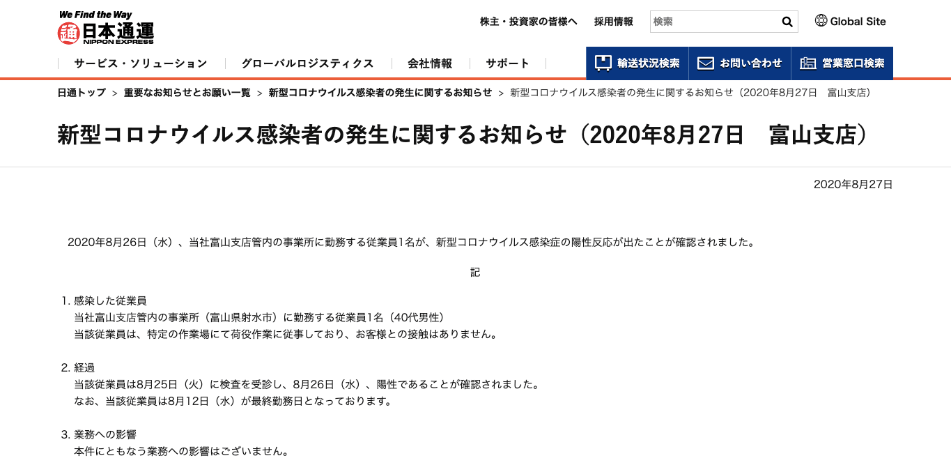 日本通運は8月27日、富山支店管内の事業所に勤務する従業員1名が、新型コロナウイルス感染症の陽性反応が出たことが確認されたと発表しました。