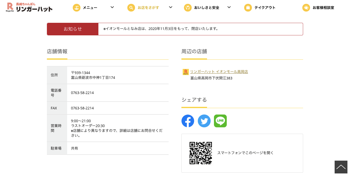 リンガーハット イオンモールとなみ店が11月3日に閉店予定です。