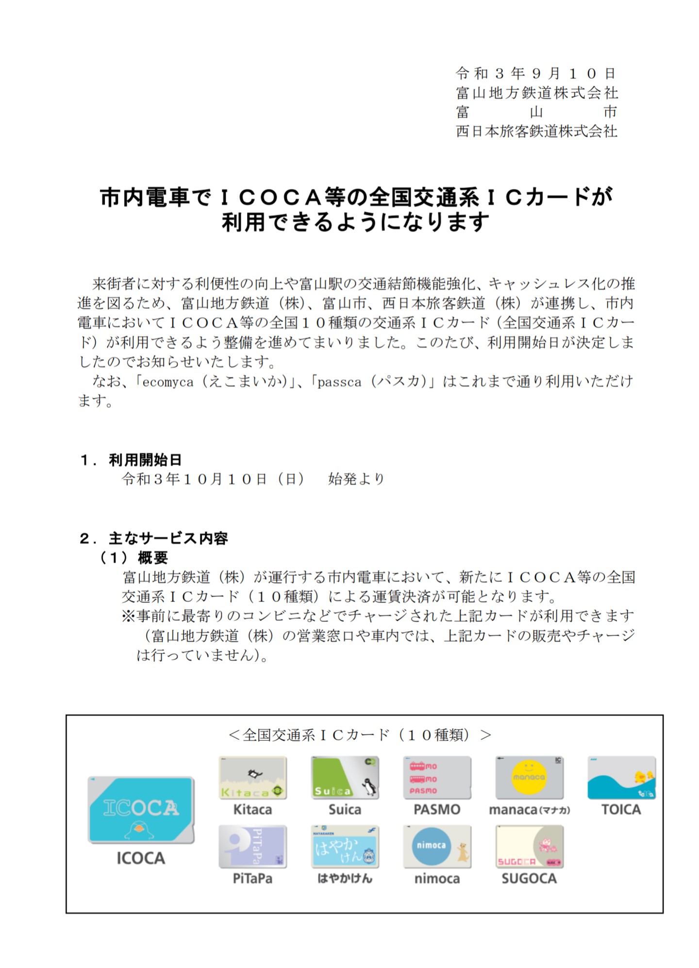 富山地方鉄道とJR西日本は、富山地方鉄道が運行する市内電車において、ICOCAなど全国10種類の交通系ICカードによる運賃決済を導入すると発表しました。