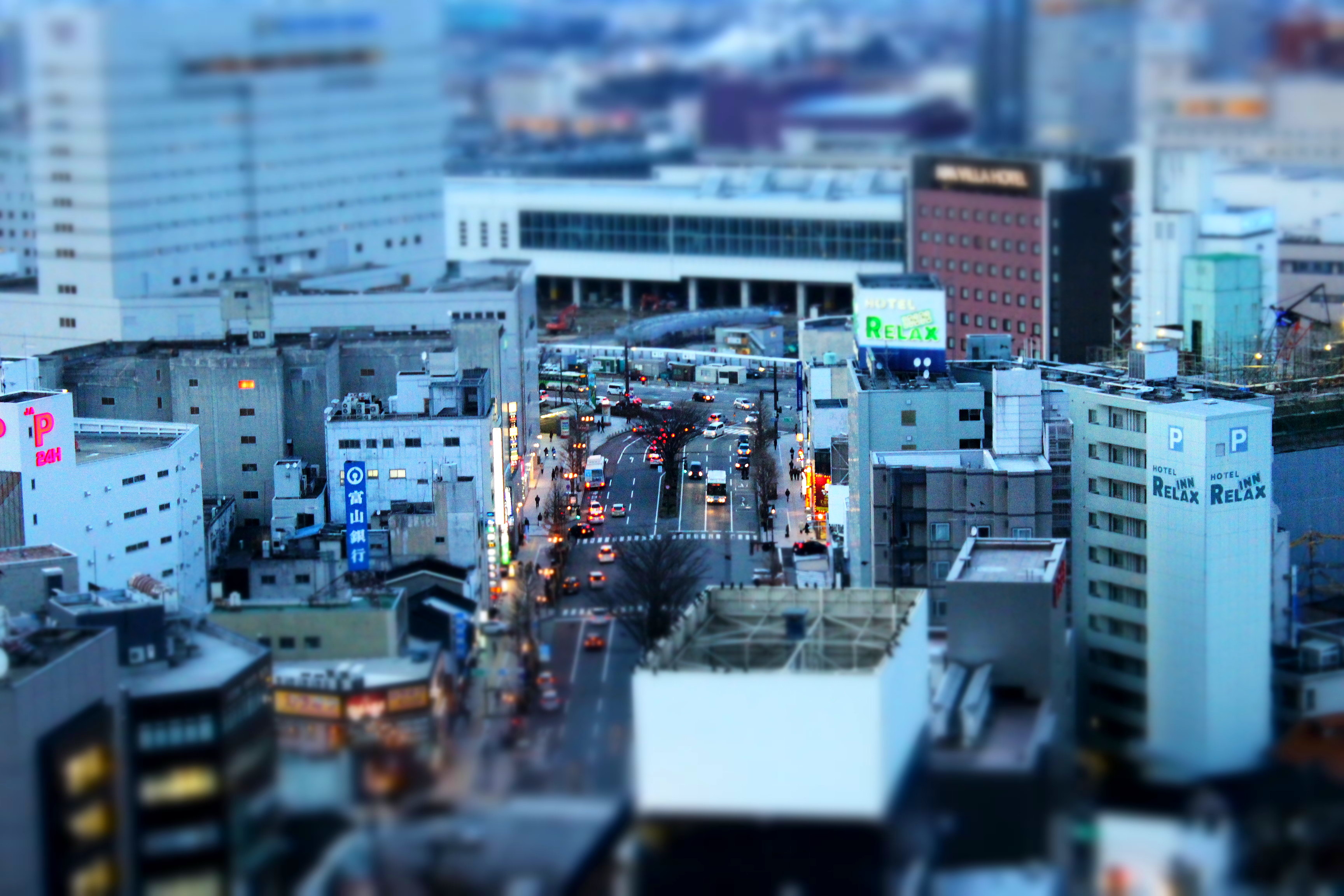 車もこんなに小さく見えますし、こうしてみると富山駅が隠れるのでやっぱりビルが多いんですね。
